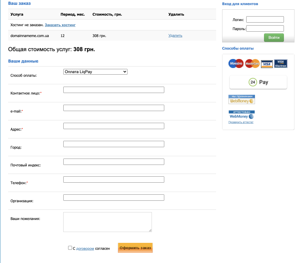 2. Следующим шагом введите контактные данные. Введите реквизиты для создания учетной записи. В качестве способа оплаты выберите платежную систему LiqPAY.