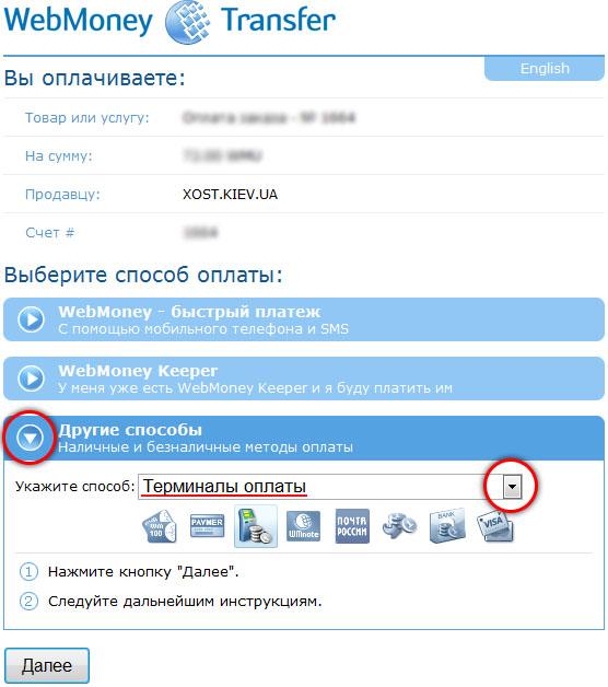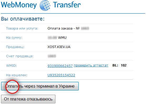 Для оплаты через терминалы оплаты необходимо в качестве метода оплаты выбрать web-money.